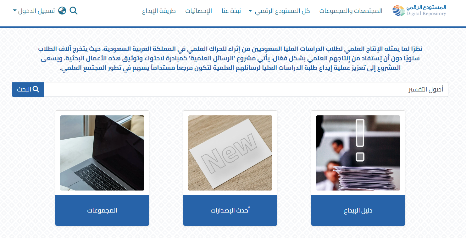 المكتبة الرقمية السعودية (SDL) تُعد أكبر مصدر للمعلومات الأكاديمية في العالم العربي. توفر وصولاً إلى العديد من قواعد البيانات العالمية والعربية التي تشمل الرسائل الجامعية.