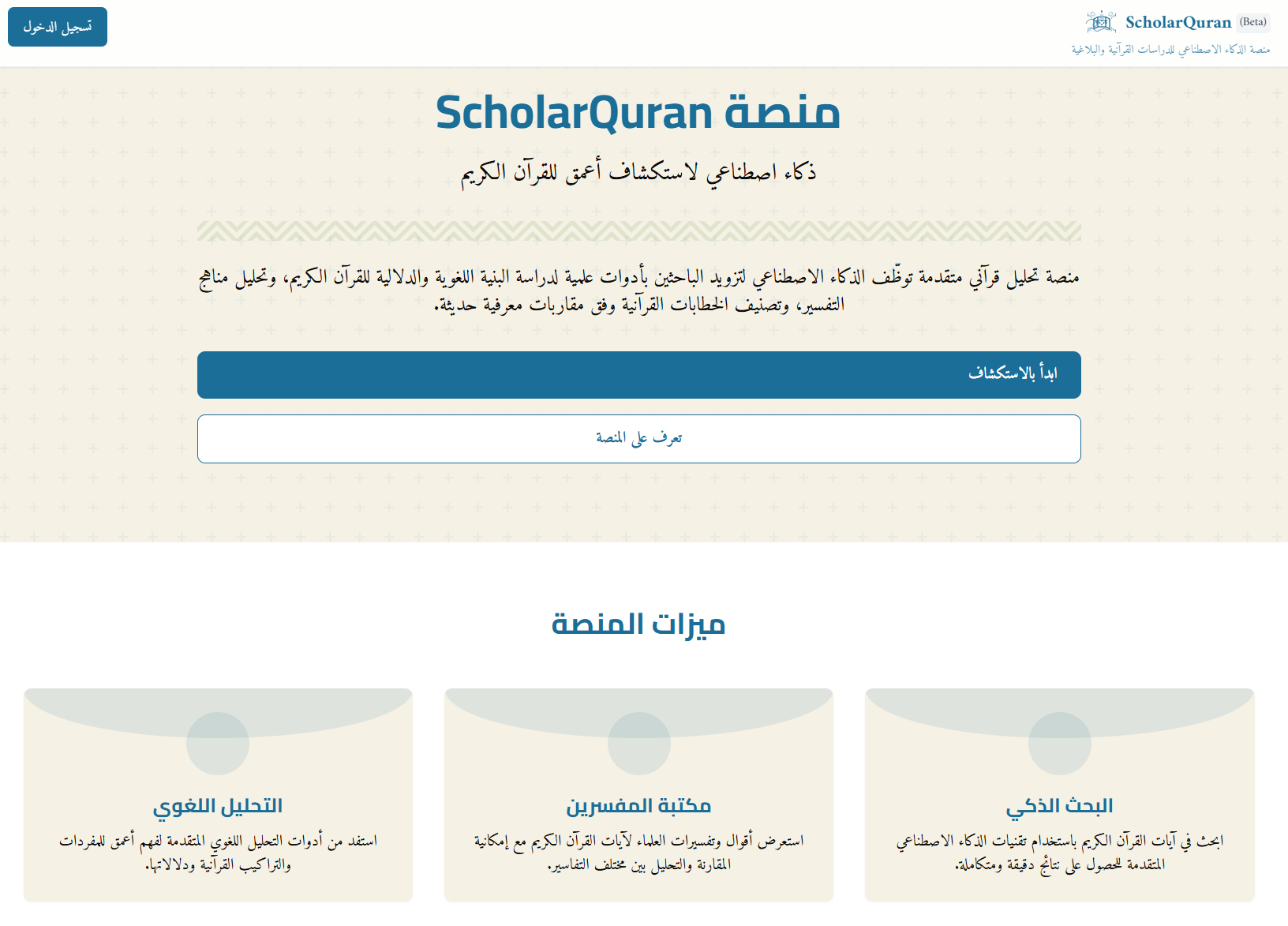 الميزات: توظيف الذكاء الاصطناعي لتحليل البنية اللغوية والدلالية للقرآن، وتحليل مناهج التفسير، وتصنيف الخطابات القرآنية، والبحث الذكي في آيات القرآن ومكتبة المفسرين.