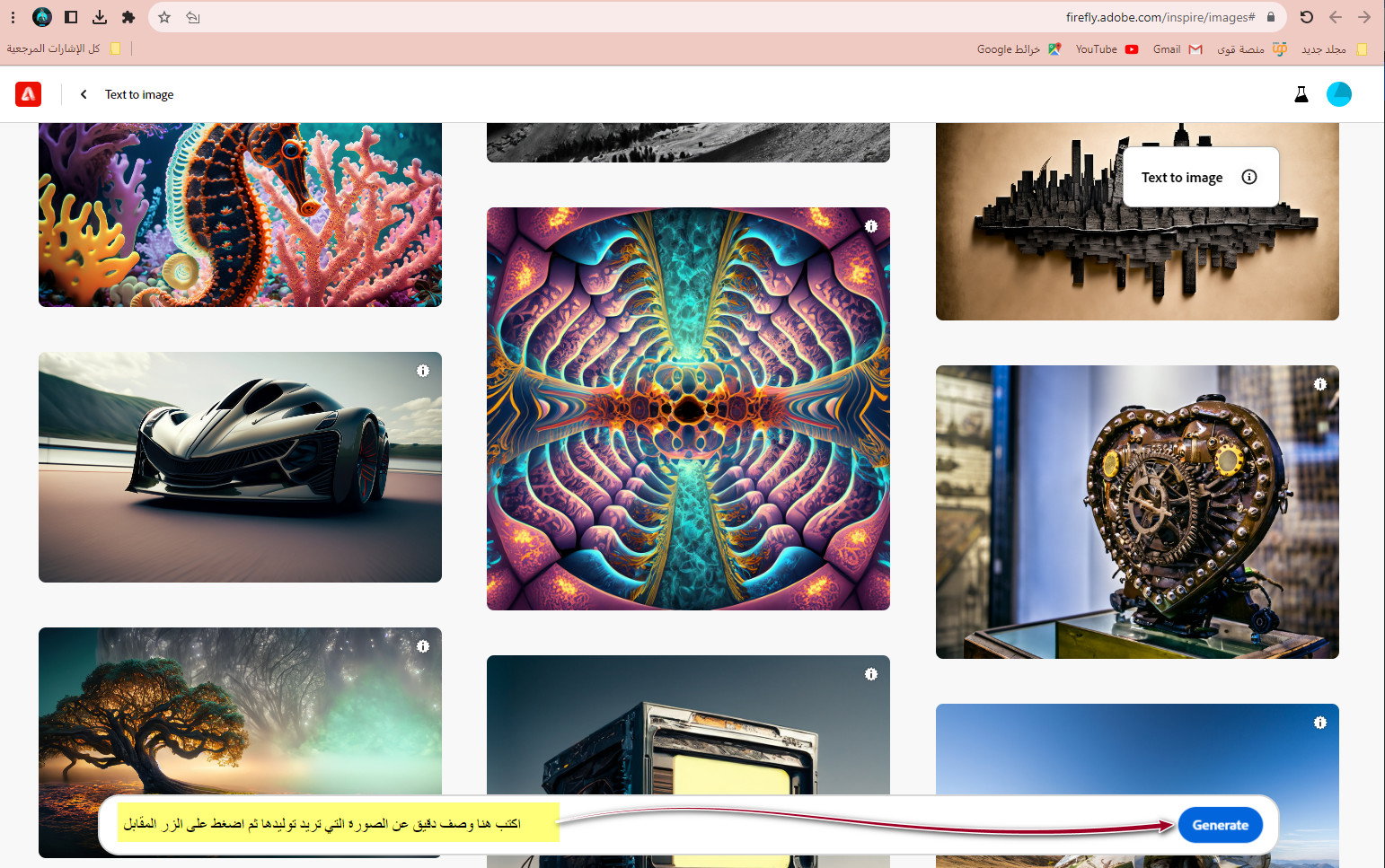 يقدم موقع Adobe Firefly العديد من الخدمات لصناعة الصور بالذكاء الاصطناعي، من تحويل النص إلى صورة، وإعادة تلوين الصور، وإنشاء صور واقعية من نموذج ثلاثي الأبعاد، وتغيير نسبة العرض إلى الارتفاع لصورتك بنقرة واحدة، واستخدام فرشاة لإزالة الأشياء من الصور أو إضافة أشياء جديدة. الموقع يدعم أكثر من 100 لغة من بينها اللغة العربية.