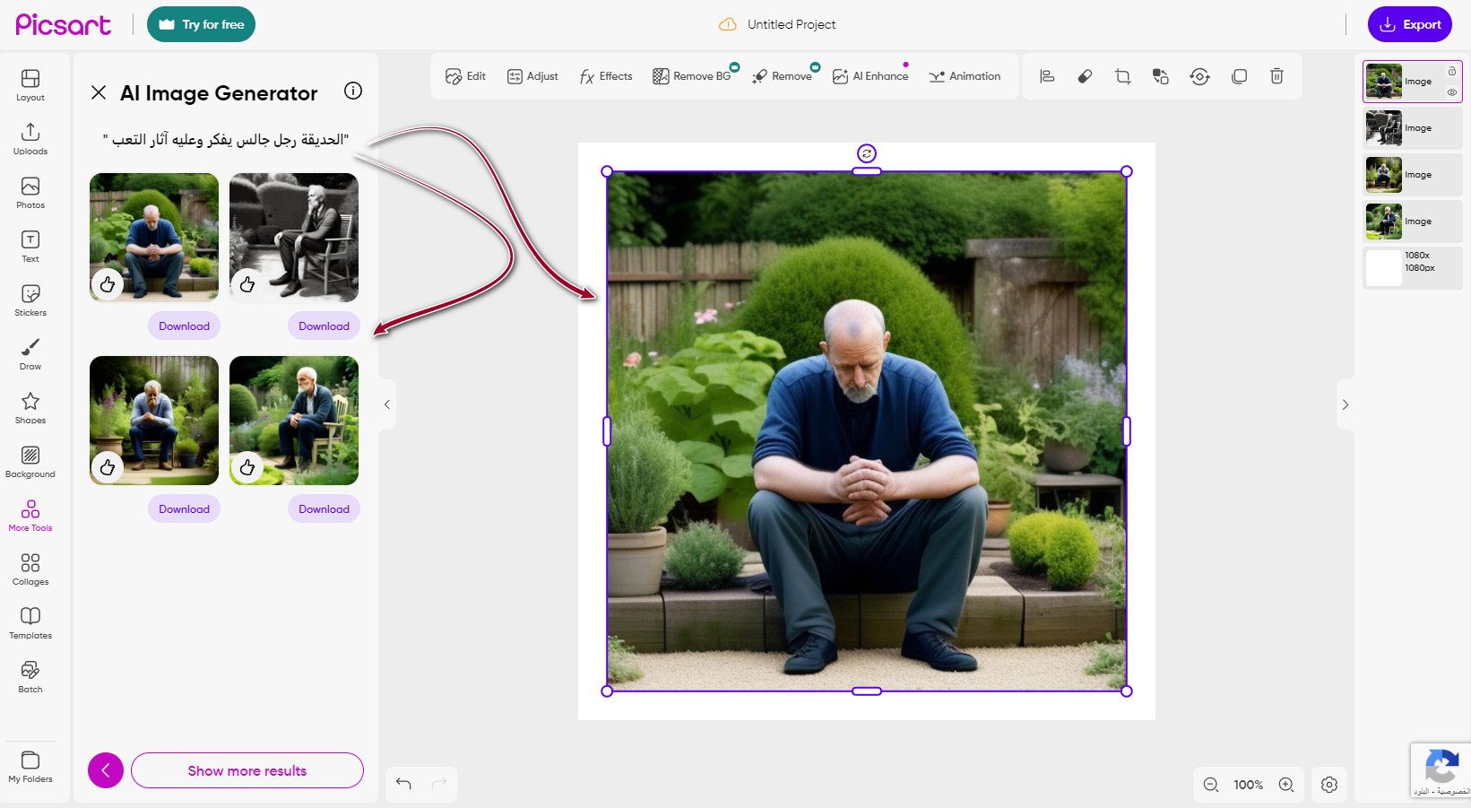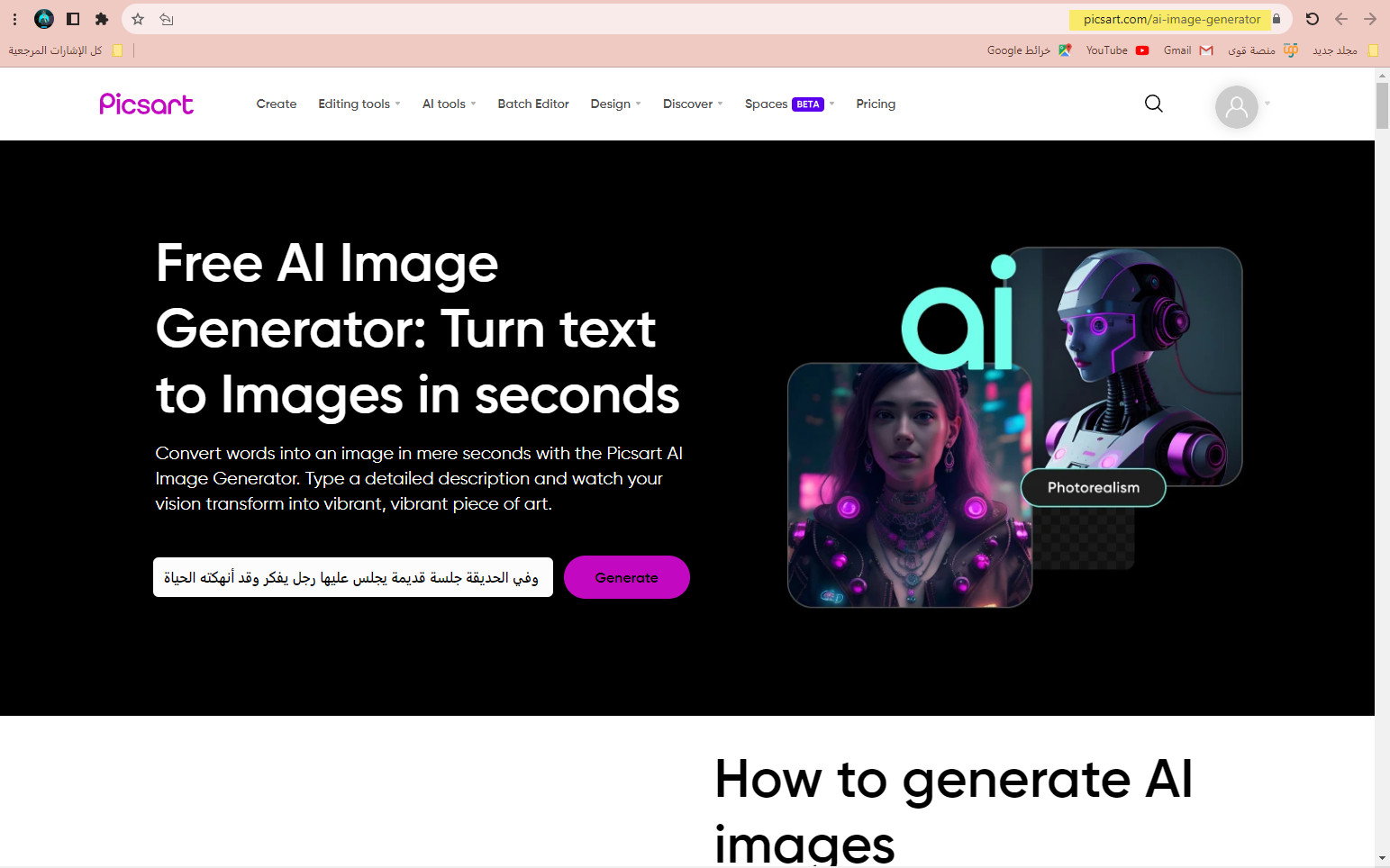 حوّل الكلمات إلى صورة في ثوانٍ معدودة باستخدام Picsart. اكتب وصفاً مفصلاً وشاهد رؤيتك تتحول إلى قطعة فنية نابضة بالحياة. واستكشف الصور التي تم إنشاؤها بواسطة الذكاء الاصطناعي في أنماط متنوعة، واكشف النقاب عن مجموعة آسرة من العناصر المرئية التي صممها الذكاء الاصطناعي.