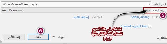 (5) من خيار (حفظ كنوع) انقر على السهم المُتجه للأسفل ثمّ اختيار pdf من القائمة المنسدلة الظاهرة .